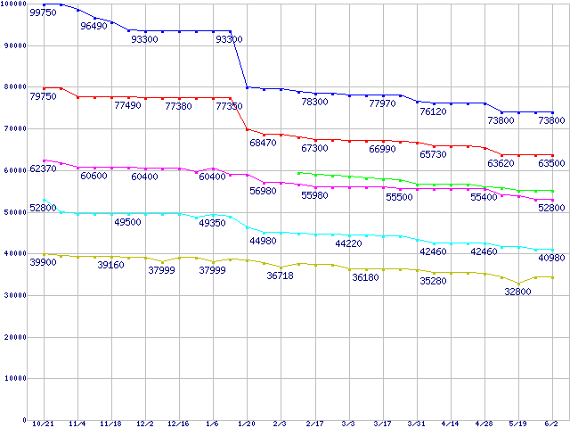 | Socket 939 (FSB 1000MHz,Dual Core)の最安値推移 | | | (2005年10月21日~2006年6月2日) |