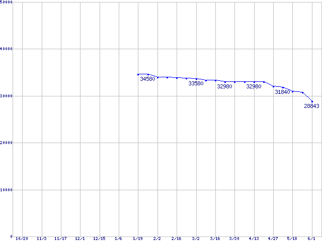 | WD Raptor (10000rpm,Serial ATA/150,16MB,TLER)の最安値推移 | | | (2005年10月20日~2006年6月1日) |