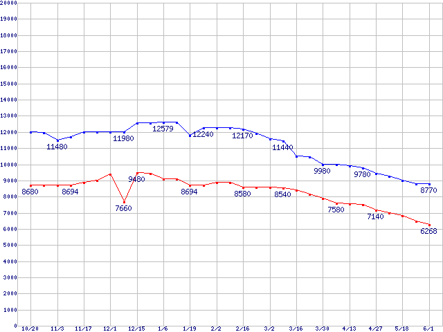 | Deskstar T7K250 (7200rpm,Serial ATA II/3Gbps)の最安値推移 | | | (2005年10月20日~2006年6月1日) |