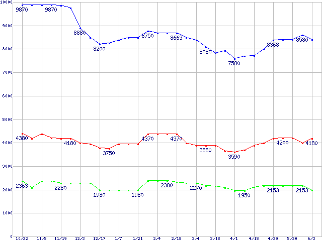 PC2-6400(DDR2-800) DDR2 SDRAM DIMMの最安値推移