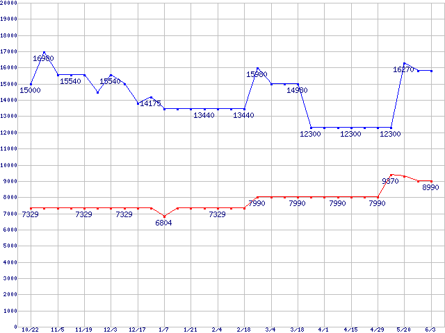| PC3200(DDR400) DDR SDRAM DIMM ECC対応 Registeredタイプの最安値推移 | | | (2005年10月22日~2006年6月3日) |