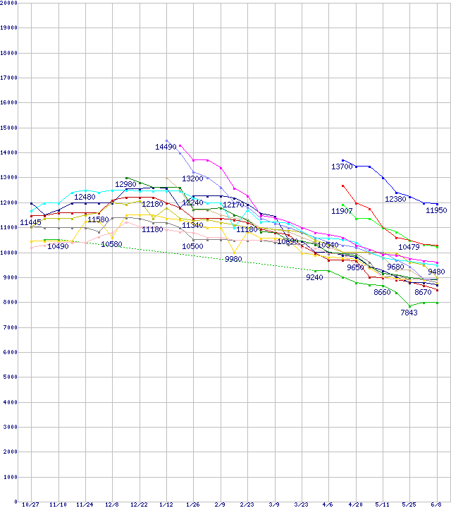 | HDD 250~300GB未満の最安値推移 | | | (2005年10月27日~2006年6月8日) |