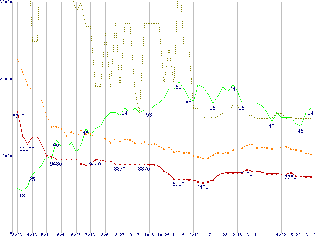 ※このグラフは過去のデータも税率5%相当に調整した税込み相当額のグラフです。 税率変更や、総額表示方式導入(2004年4月)の影響は除いています。 | | | ●凡例 | 最安値 (点線部は販売店未確認 または未調査) | 平均値 | 最高値 | ショップ数 |
