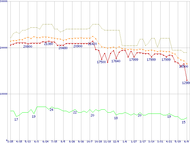 ※このグラフは過去のデータも税率5%相当に調整した税込み相当額のグラフです。 税率変更や、総額表示方式導入(2004年4月)の影響は除いています。 | | | ●凡例 | 最安値 (点線部は販売店未確認 または未調査) | 平均値 | 最高値 | ショップ数 |