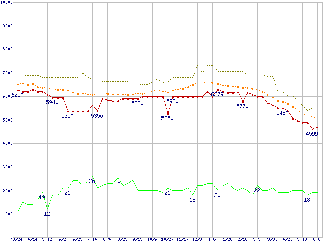 ※このグラフは過去のデータも税率5%相当に調整した税込み相当額のグラフです。 税率変更や、総額表示方式導入(2004年4月)の影響は除いています。 | | | ●凡例 | 最安値 (点線部は販売店未確認 または未調査) | 平均値 | 最高値 | ショップ数 |