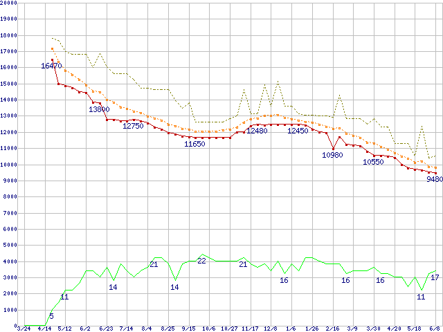 ※このグラフは過去のデータも税率5%相当に調整した税込み相当額のグラフです。 税率変更や、総額表示方式導入(2004年4月)の影響は除いています。 | | | ●凡例 | 最安値 (点線部は販売店未確認 または未調査) | 平均値 | 最高値 | ショップ数 |