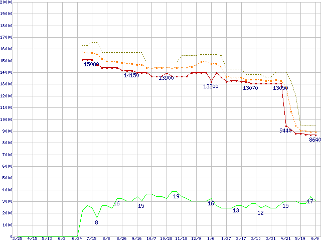 ※このグラフは過去のデータも税率5%相当に調整した税込み相当額のグラフです。 税率変更や、総額表示方式導入(2004年4月)の影響は除いています。 | | | ●凡例 | 最安値 (点線部は販売店未確認 または未調査) | 平均値 | 最高値 | ショップ数 |
