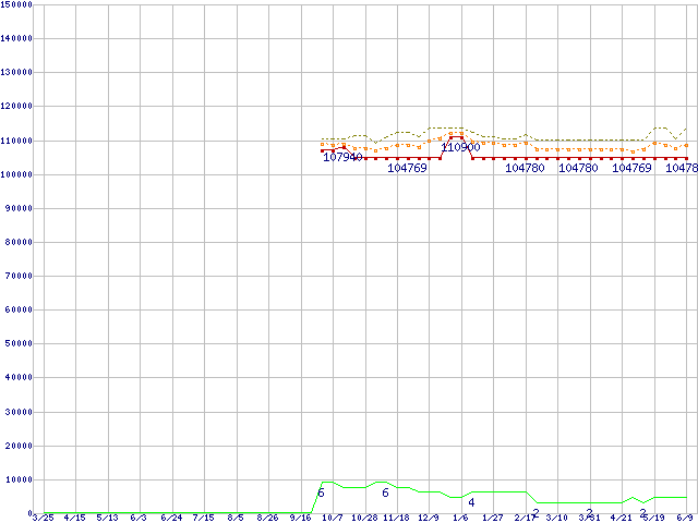 ※このグラフは過去のデータも税率5%相当に調整した税込み相当額のグラフです。 税率変更や、総額表示方式導入(2004年4月)の影響は除いています。 | | | ●凡例 | 最安値 (点線部は販売店未確認 または未調査) | 平均値 | 最高値 | ショップ数 |