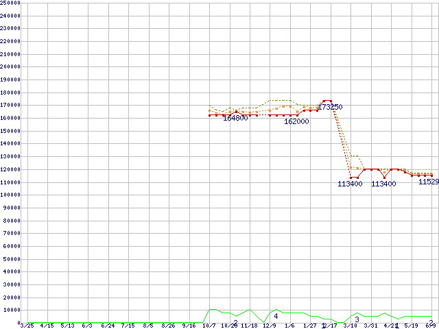 ※このグラフは過去のデータも税率5%相当に調整した税込み相当額のグラフです。 税率変更や、総額表示方式導入(2004年4月)の影響は除いています。 | | | ●凡例 | 最安値 (点線部は販売店未確認 または未調査) | 平均値 | 最高値 | ショップ数 |