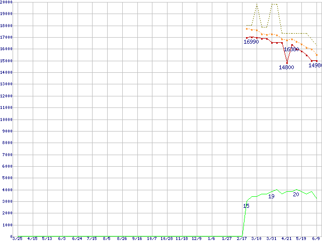 ※このグラフは過去のデータも税率5%相当に調整した税込み相当額のグラフです。 税率変更や、総額表示方式導入(2004年4月)の影響は除いています。 | | | ●凡例 | 最安値 (点線部は販売店未確認 または未調査) | 平均値 | 最高値 | ショップ数 |