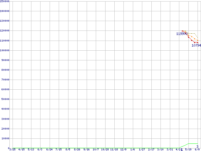 ※このグラフは過去のデータも税率5%相当に調整した税込み相当額のグラフです。 税率変更や、総額表示方式導入(2004年4月)の影響は除いています。 | | | ●凡例 | 最安値 (点線部は販売店未確認 または未調査) | 平均値 | 最高値 | ショップ数 |