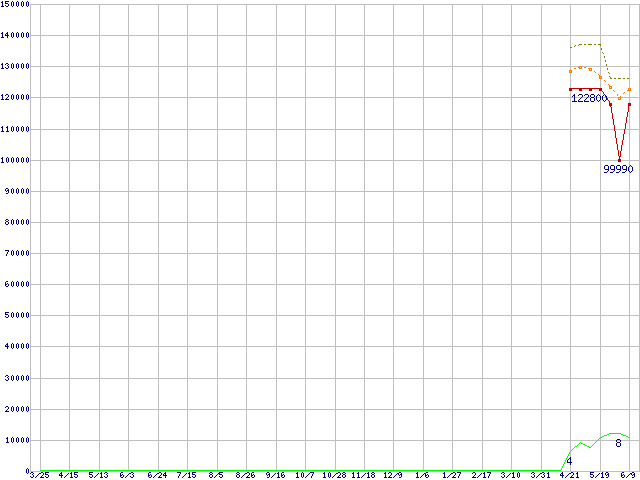 ※このグラフは過去のデータも税率5%相当に調整した税込み相当額のグラフです。 税率変更や、総額表示方式導入(2004年4月)の影響は除いています。 | | | ●凡例 | 最安値 (点線部は販売店未確認 または未調査) | 平均値 | 最高値 | ショップ数 |