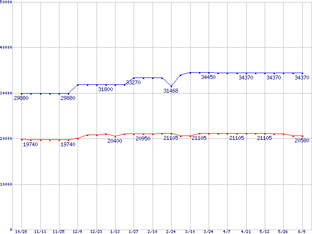 | Socket 478 (FSB 800MHz,L2 1MB,Hyper-Threading)の最安値推移 | | | (2005年10月28日~2006年6月9日) |