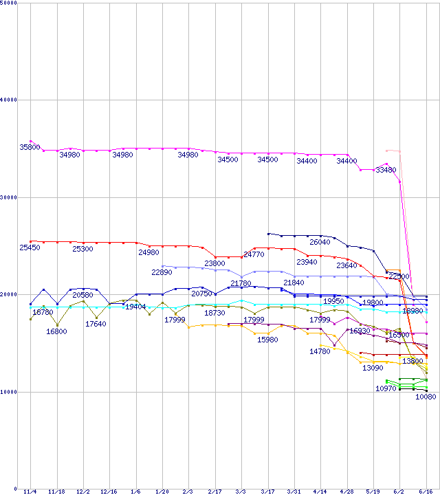 | CPU主要製品(最安値1万円~2万円未満)の最安値推移 | | | (2005年11月4日~2006年6月16日) |