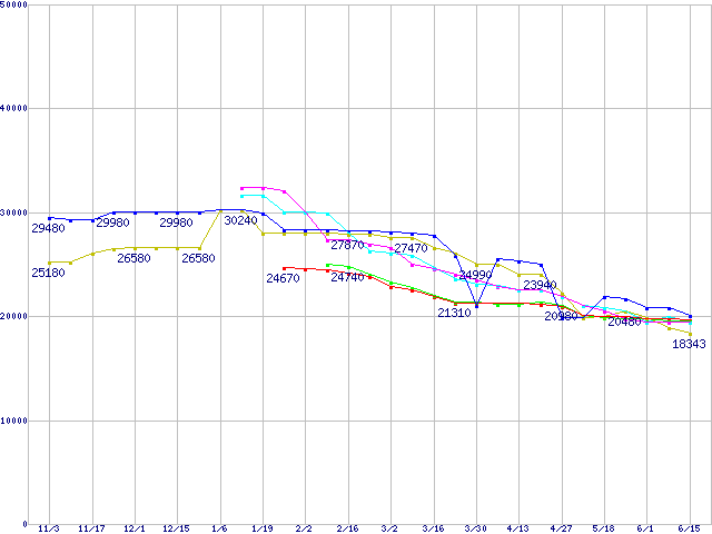 HDD主要製品(最安値1万5千円~2万円未満)の最安値推移