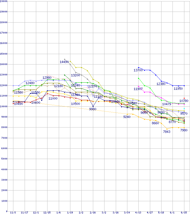 | HDD 250~300GB未満の最安値推移 | | | (2005年11月3日~2006年6月15日) |