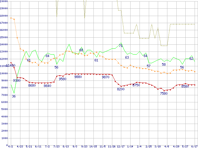 ※このグラフは過去のデータも税率5%相当に調整した税込み相当額のグラフです。 税率変更や、総額表示方式導入(2004年4月)の影響は除いています。 | | | ●凡例 | 最安値 (点線部は販売店未確認 または未調査) | 平均値 | 最高値 | ショップ数 |