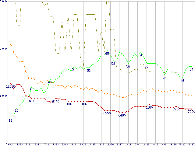 ※このグラフは過去のデータも税率5%相当に調整した税込み相当額のグラフです。 税率変更や、総額表示方式導入(2004年4月)の影響は除いています。 | | | ●凡例 | 最安値 (点線部は販売店未確認 または未調査) | 平均値 | 最高値 | ショップ数 |