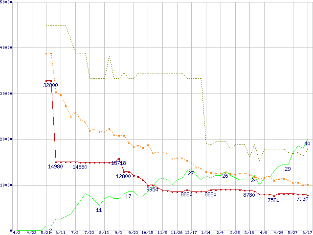 ※このグラフは過去のデータも税率5%相当に調整した税込み相当額のグラフです。 税率変更や、総額表示方式導入(2004年4月)の影響は除いています。 | | | ●凡例 | 最安値 (点線部は販売店未確認 または未調査) | 平均値 | 最高値 | ショップ数 |