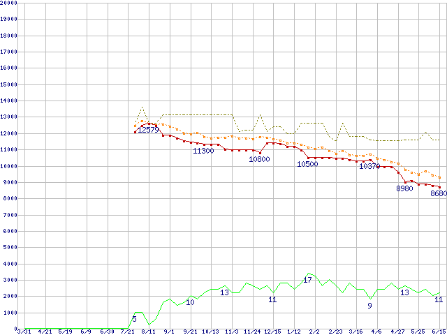 ※このグラフは過去のデータも税率5%相当に調整した税込み相当額のグラフです。 税率変更や、総額表示方式導入(2004年4月)の影響は除いています。 | | | ●凡例 | 最安値 (点線部は販売店未確認 または未調査) | 平均値 | 最高値 | ショップ数 |