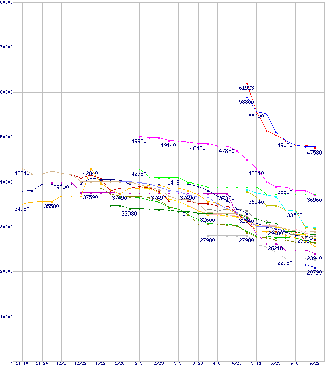 | HDD主要製品(最安値2万円以上)の最安値推移 | | | (2005年11月10日~2006年6月22日) |