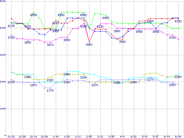 メモリ主要製品(最安値5千円未満)の最安値推移