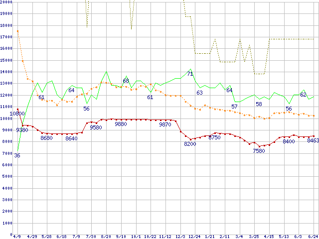 ※このグラフは過去のデータも税率5%相当に調整した税込み相当額のグラフです。 税率変更や、総額表示方式導入(2004年4月)の影響は除いています。 | | | ●凡例 | 最安値 (点線部は販売店未確認 または未調査) | 平均値 | 最高値 | ショップ数 |