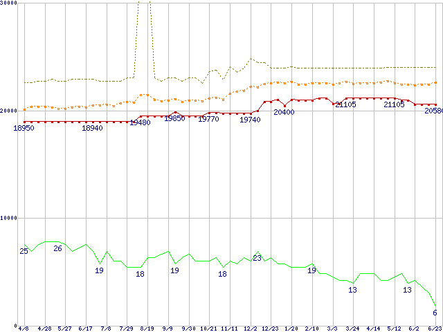 ※このグラフは過去のデータも税率5%相当に調整した税込み相当額のグラフです。 税率変更や、総額表示方式導入(2004年4月)の影響は除いています。 | | | ●凡例 | 最安値 (点線部は販売店未確認 または未調査) | 平均値 | 最高値 | ショップ数 |
