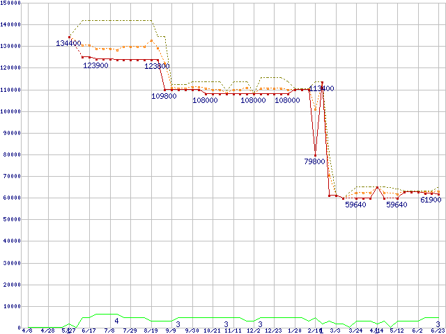 ※このグラフは過去のデータも税率5%相当に調整した税込み相当額のグラフです。 税率変更や、総額表示方式導入(2004年4月)の影響は除いています。 | | | ●凡例 | 最安値 (点線部は販売店未確認 または未調査) | 平均値 | 最高値 | ショップ数 |