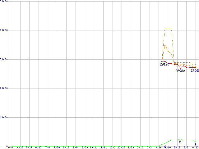 ※このグラフは過去のデータも税率5%相当に調整した税込み相当額のグラフです。 税率変更や、総額表示方式導入(2004年4月)の影響は除いています。 | | | ●凡例 | 最安値 (点線部は販売店未確認 または未調査) | 平均値 | 最高値 | ショップ数 |