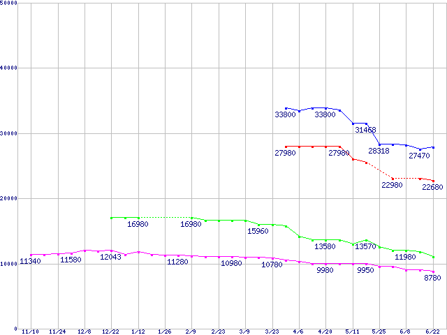 | WD Caviar SE16 (7200rpm,Serial ATA II/3Gbps,16MB)の最安値推移 | | | (2005年11月10日~2006年6月22日) |