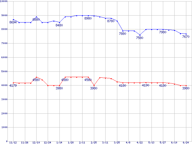 PC2-5300(DDR2-667) DDR2 SDRAM DIMMの最安値推移