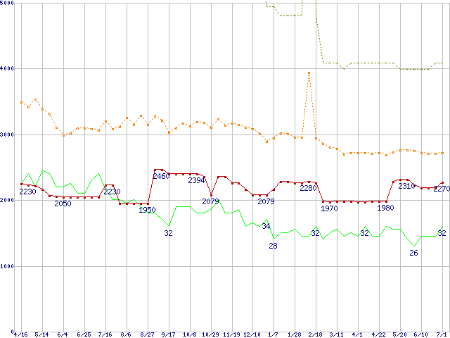 ※このグラフは過去のデータも税率5%相当に調整した税込み相当額のグラフです。 税率変更や、総額表示方式導入(2004年4月)の影響は除いています。 | | | ●凡例 | 最安値 (点線部は販売店未確認 または未調査) | 平均値 | 最高値 | ショップ数 |