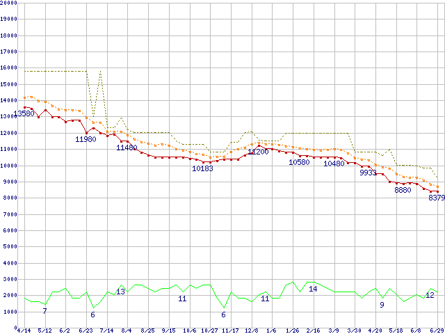 ※このグラフは過去のデータも税率5%相当に調整した税込み相当額のグラフです。 税率変更や、総額表示方式導入(2004年4月)の影響は除いています。 | | | ●凡例 | 最安値 (点線部は販売店未確認 または未調査) | 平均値 | 最高値 | ショップ数 |