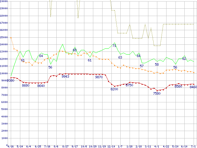※このグラフは過去のデータも税率5%相当に調整した税込み相当額のグラフです。 税率変更や、総額表示方式導入(2004年4月)の影響は除いています。 | | | ●凡例 | 最安値 (点線部は販売店未確認 または未調査) | 平均値 | 最高値 | ショップ数 |