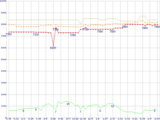 ※このグラフは過去のデータも税率5%相当に調整した税込み相当額のグラフです。 税率変更や、総額表示方式導入(2004年4月)の影響は除いています。 | | | ●凡例 | 最安値 (点線部は販売店未確認 または未調査) | 平均値 | 最高値 | ショップ数 |