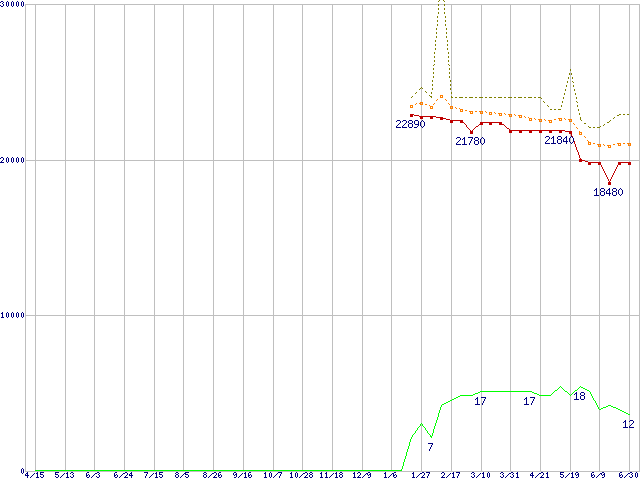 ※このグラフは過去のデータも税率5%相当に調整した税込み相当額のグラフです。 税率変更や、総額表示方式導入(2004年4月)の影響は除いています。 | | | ●凡例 | 最安値 (点線部は販売店未確認 または未調査) | 平均値 | 最高値 | ショップ数 |