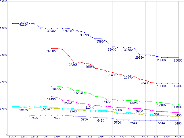 | Barracuda 7200.9 (7200rpm,Serial ATA II/3Gbps)の最安値推移 | | | (2005年11月17日~2006年6月29日) |