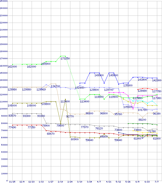 | CPU主要製品(最安値6万円以上)の最安値推移 | | | (2005年11月25日~2006年7月7日) |