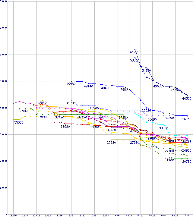 | HDD主要製品(最安値2万円以上)の最安値推移 | | | (2005年11月24日~2006年7月6日) |