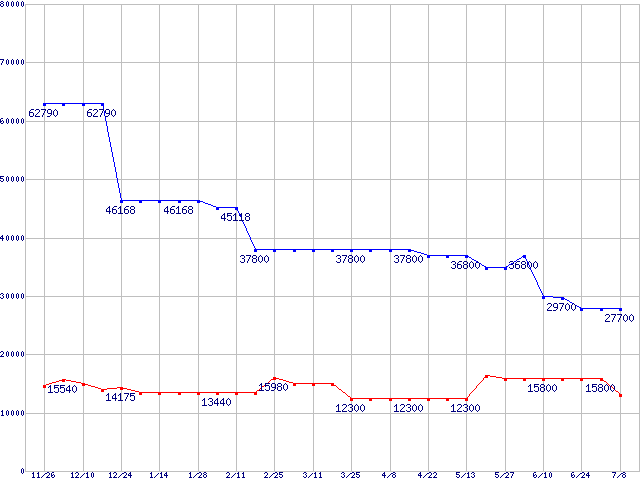 メモリ主要製品(最安値1万円以上)の最安値推移