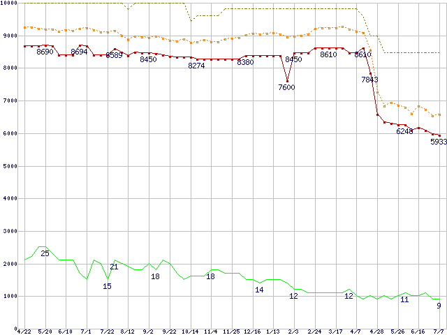 ※このグラフは過去のデータも税率5%相当に調整した税込み相当額のグラフです。 税率変更や、総額表示方式導入(2004年4月)の影響は除いています。 | | | ●凡例 | 最安値 (点線部は販売店未確認 または未調査) | 平均値 | 最高値 | ショップ数 |