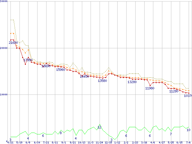 ※このグラフは過去のデータも税率5%相当に調整した税込み相当額のグラフです。 税率変更や、総額表示方式導入(2004年4月)の影響は除いています。 | | | ●凡例 | 最安値 (点線部は販売店未確認 または未調査) | 平均値 | 最高値 | ショップ数 |