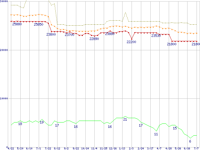 ※このグラフは過去のデータも税率5%相当に調整した税込み相当額のグラフです。 税率変更や、総額表示方式導入(2004年4月)の影響は除いています。 | | | ●凡例 | 最安値 (点線部は販売店未確認 または未調査) | 平均値 | 最高値 | ショップ数 |