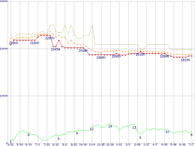 ※このグラフは過去のデータも税率5%相当に調整した税込み相当額のグラフです。 税率変更や、総額表示方式導入(2004年4月)の影響は除いています。 | | | ●凡例 | 最安値 (点線部は販売店未確認 または未調査) | 平均値 | 最高値 | ショップ数 |