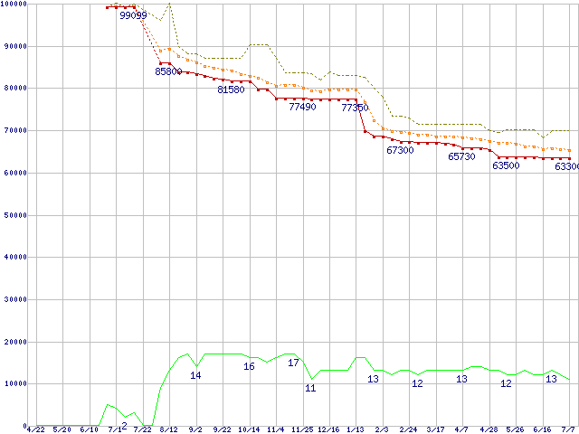 ※このグラフは過去のデータも税率5%相当に調整した税込み相当額のグラフです。 税率変更や、総額表示方式導入(2004年4月)の影響は除いています。 | | | ●凡例 | 最安値 (点線部は販売店未確認 または未調査) | 平均値 | 最高値 | ショップ数 |