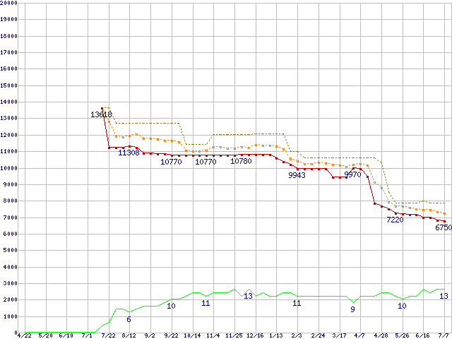 ※このグラフは過去のデータも税率5%相当に調整した税込み相当額のグラフです。 税率変更や、総額表示方式導入(2004年4月)の影響は除いています。 | | | ●凡例 | 最安値 (点線部は販売店未確認 または未調査) | 平均値 | 最高値 | ショップ数 |