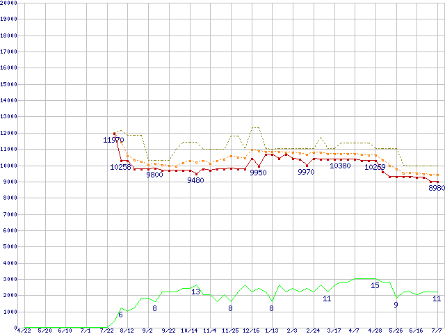 ※このグラフは過去のデータも税率5%相当に調整した税込み相当額のグラフです。 税率変更や、総額表示方式導入(2004年4月)の影響は除いています。 | | | ●凡例 | 最安値 (点線部は販売店未確認 または未調査) | 平均値 | 最高値 | ショップ数 |