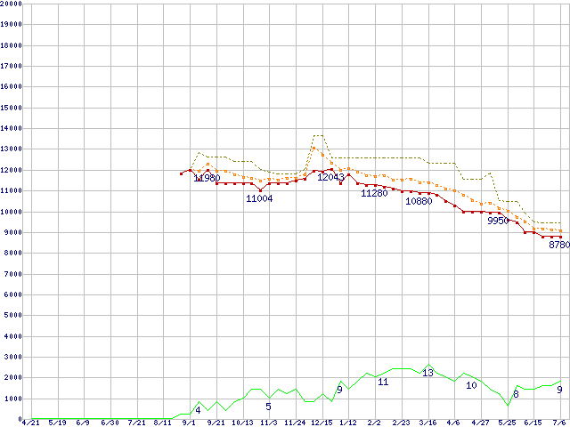 ※このグラフは過去のデータも税率5%相当に調整した税込み相当額のグラフです。 税率変更や、総額表示方式導入(2004年4月)の影響は除いています。 | | | ●凡例 | 最安値 (点線部は販売店未確認 または未調査) | 平均値 | 最高値 | ショップ数 |