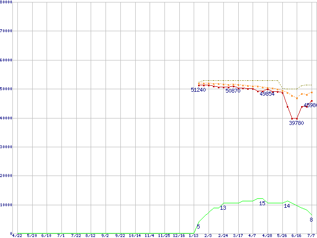 ※このグラフは過去のデータも税率5%相当に調整した税込み相当額のグラフです。 税率変更や、総額表示方式導入(2004年4月)の影響は除いています。 | | | ●凡例 | 最安値 (点線部は販売店未確認 または未調査) | 平均値 | 最高値 | ショップ数 |